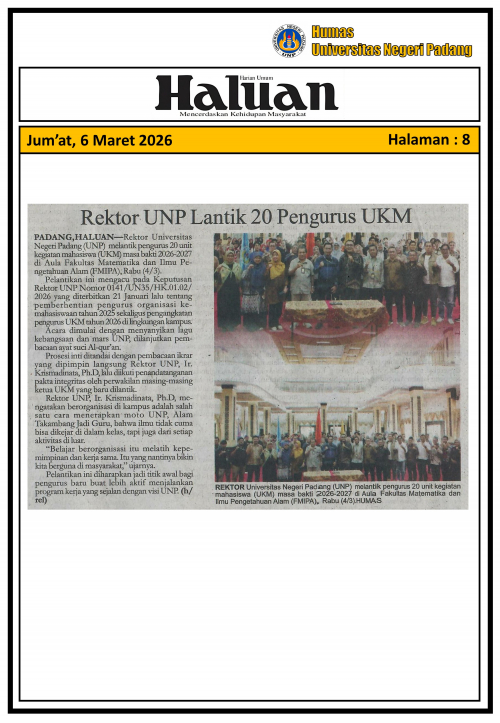 UNP Bertekad Perkuat Implementasi Zona Integritas (Haluan) Jumat, 13 Februari 2026 | 00:00 WIB 1 month Albums