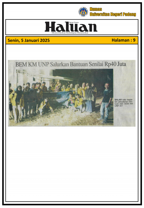 BEM KM UNP Salurkan Bantuan Senilai RP.40 Juta (Haluan) Senin, 5 Januari 2026 | 00:00 WIB 1 week Albums