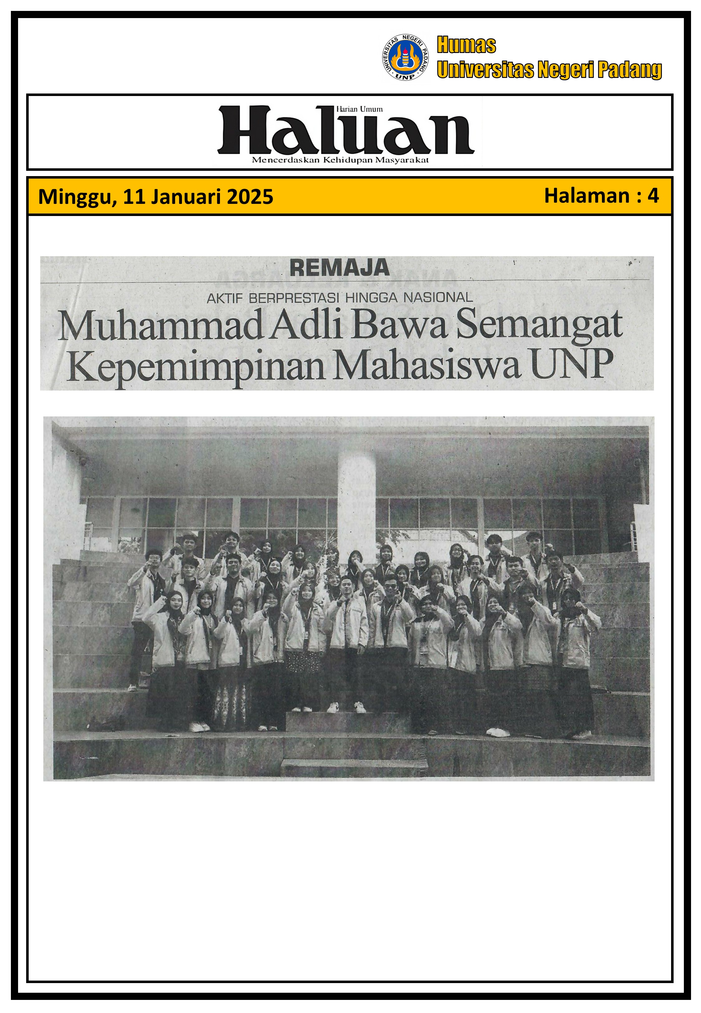 Muhammad Adli Bawa Semangat Kepemimpinan Mahasiswa UNP (Haluan) Minggu, 11 Januari 2026 | 00:00 WIB 4 days Albums