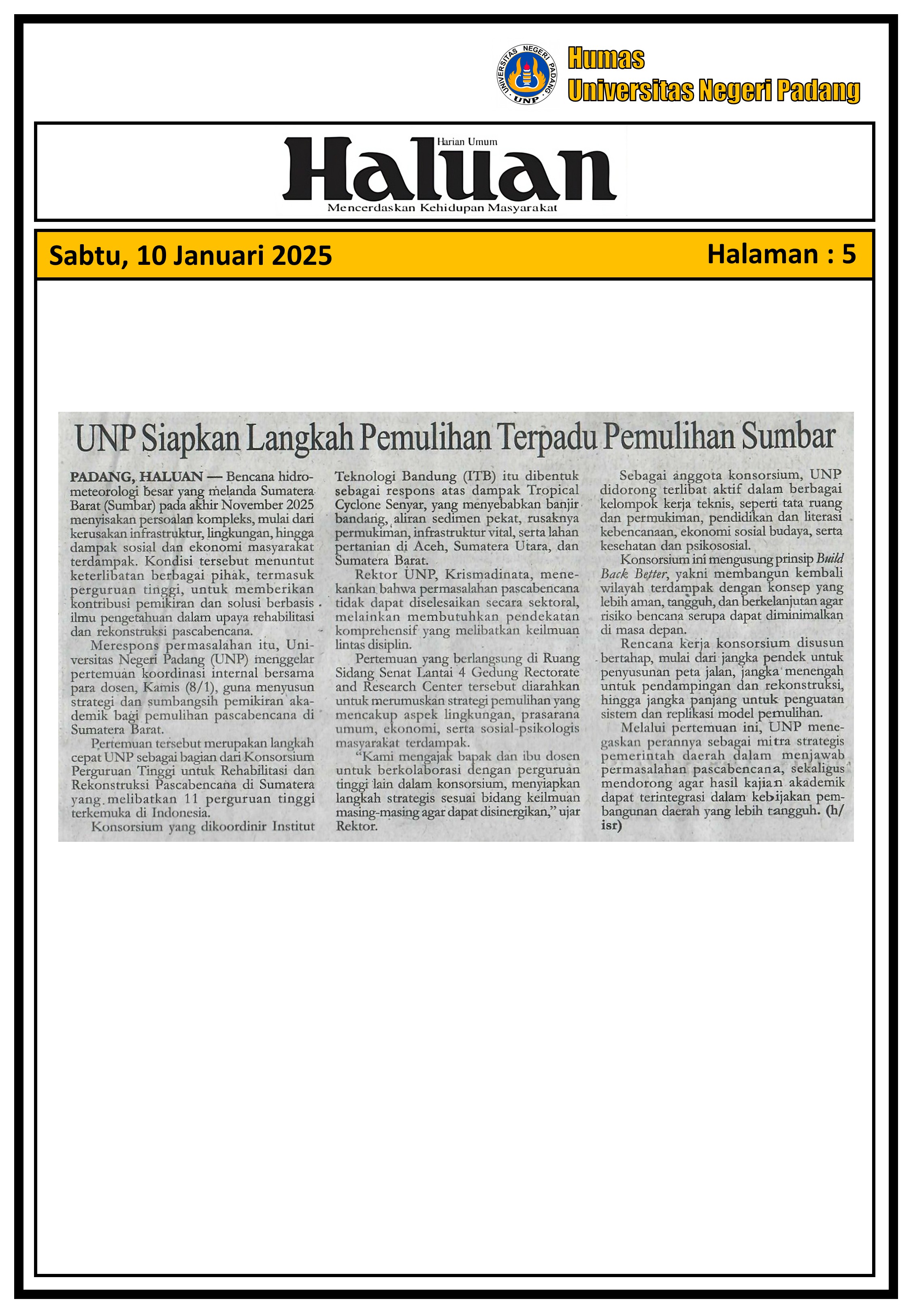UNP Siapkan Langkah Pemulihan Terpadu Pemulihan Sumbar (Haluan) Sabtu, 10 Januari 2026 | 00:00 WIB 5 days Albums