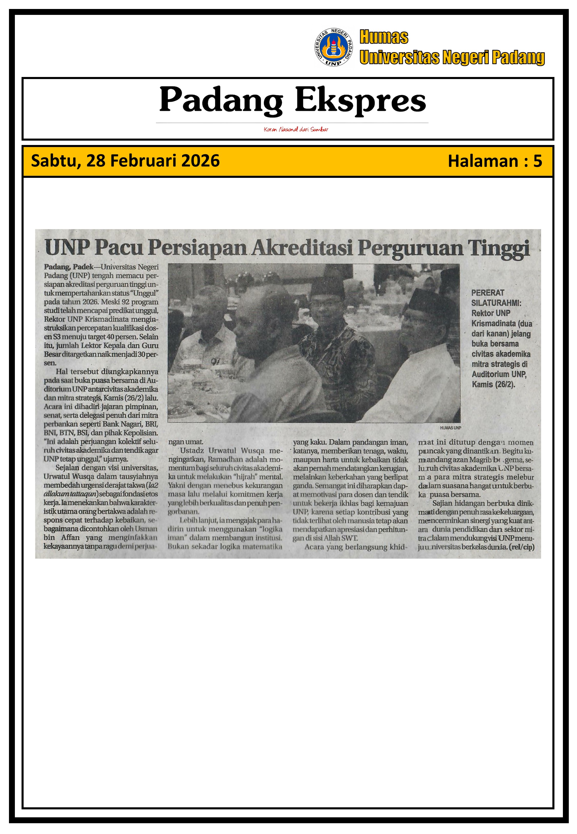 UNP Pacu Persiapan Akreditasi Perguruan Tinggi (Padek) Minggu, 1 Maret 2026 | 00:00 WIB 2 weeks Albums