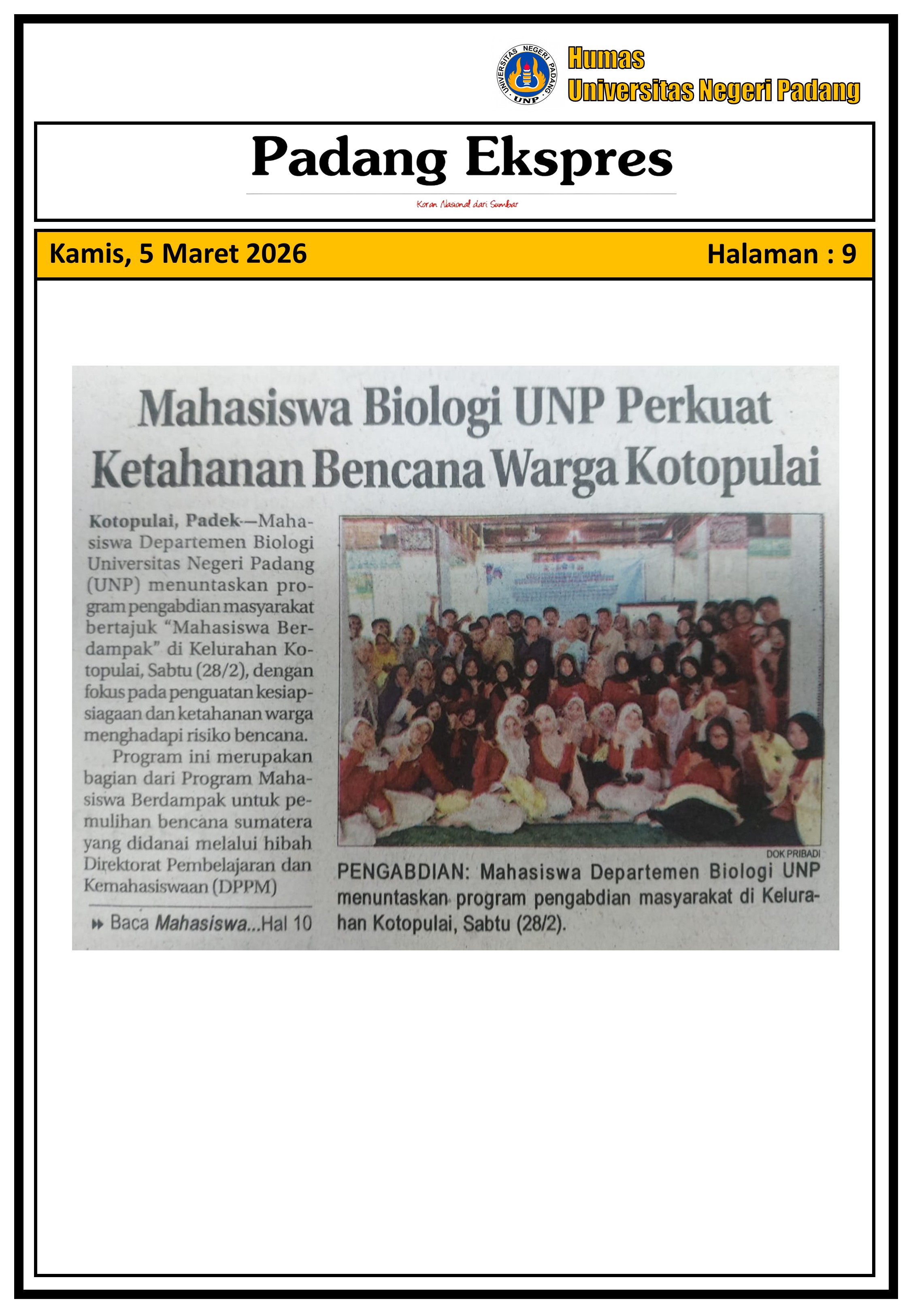 Mahasiswa Biologi UNP Perkuat Ketahanan Bencana Warga Kotopulai (Padek) Kamis, 5 Maret 2026 | 00:00 WIB 2 weeks Albums
