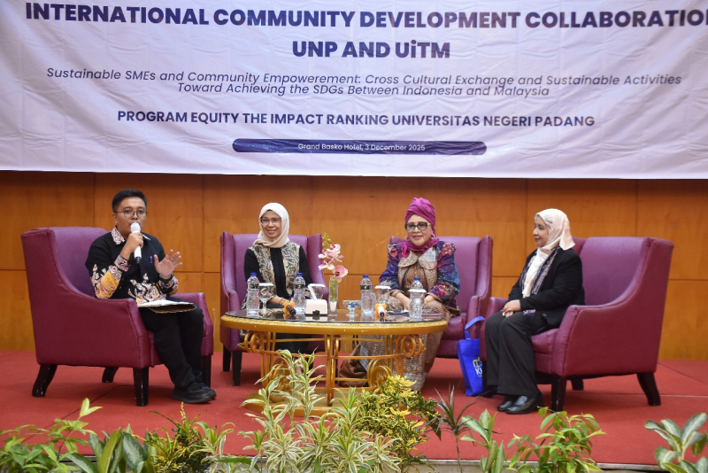 Padang, 3 Desember 2025 — Universitas Negeri Padang (UNP) bersama Universiti Teknologi MARA (UiTM) Malaysia sukses menyelenggarakan International Community Development Collaboration bertema “Sustainable SMEs and Community Empowerment: Cross-Cultural Exchange and Sustainable Activities Toward Achieving the SDGs Between Indonesia and Malaysia” di Grand Basko Hotel, Padang.