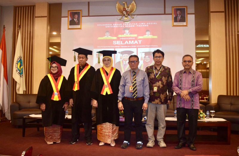 Padang—Setelah selesainya upacara pengukuhan 3 orang Guru Besar (GB) di Fakultas Ilmu Sosial Universitas Negeri Padang (FIS – UNP), yakni Prof. Susi Fitra Dewi, S. Sos, M.Si, Ph.D (Bidang Sosiologi Konflik), Prof. Dr. Erianjoni, S.Sos, M.Si (Bidang Pembelajaran Sosiologi) dan Prof. Dr. Ernawati, M.Si (Pendidikan Lingkungan Hidup dan Kebencanaan) Selasa 6 April 2026, digelar acara syukuran di Aula FIS UNP Kampus Air Tawar Padang. Kegiatan ini dihadiri oleh jajaran pimpinan UNP yakni Rektor UNP Krismadinata, Ph.D, Wakil Rektor Bidang Akademik, Kemahasiswaan dan Alumni Prof. Dr. Refnaldi, M.Litt, Wakil Rektor Bidang Keuangan, Umum, Aset dan Usaha Prof. Remon Lapisa, M.Sc, Ph.D, Wakil Rektor Bidang SDM dan TIK Prof. Dr. Anni Faridah, M. Si, Dekan Fakultas Ilmu Pendidikan (FIP) Prof. Dr. Afdal, M.Pd, Dekan Fakultas Ekonomi dan Bisnis (FEB) Prof. Perengki Susanto, M.Si, Ph.D, Dekan Fakultas Psikologi dan Kesehatan (FPK) Prof. Dr. Suryanef serta Ketua Lembaga Penelitian dan Pengabdian Masyarakat (LPPM) Prof. Dr. Anton Komaini, M.Si.