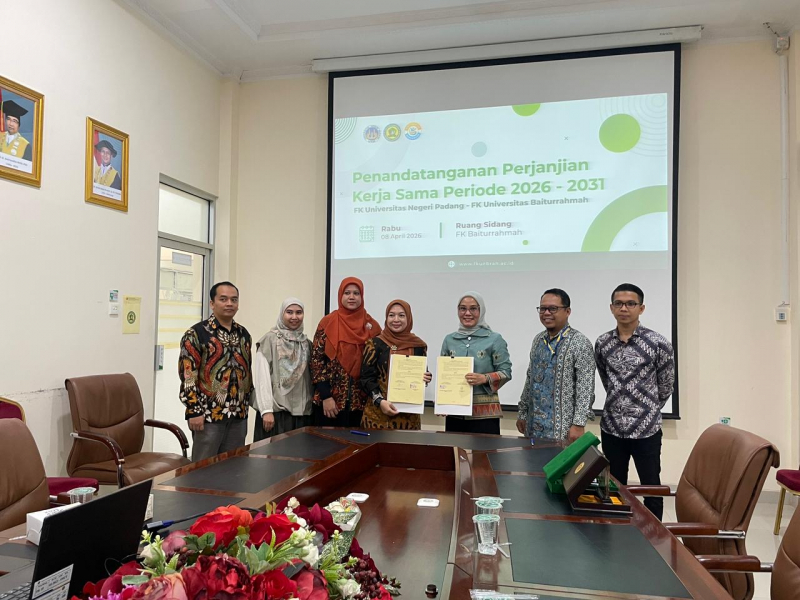 Padang, 8 April 2026 – Fakultas Kedokteran Universitas Negeri Padang (FK UNP) bersama Fakultas Kedokteran Universitas Baiturrahmah secara resmi melaksanakan penandatanganan perjanjian kerja sama sebagai langkah strategis dalam memperkuat implementasi Tridharma Perguruan Tinggi, yang meliputi bidang pendidikan, penelitian, dan pengabdian kepada masyarakat.