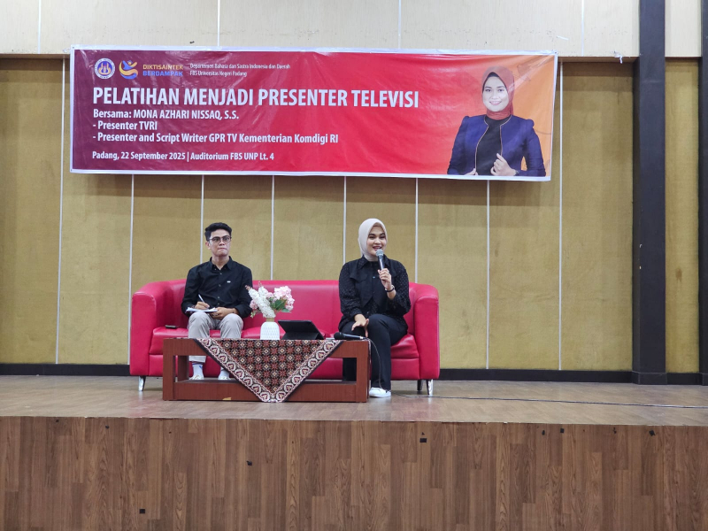 Kegiatan menghadirkan narasumber Mona Azhari Nissaq, Presenter TVRI sekaligus Presenter dan Script Writer Government Public Relation (GPR) TV Kementerian Komunikasi dan Digital Republik Indonesia. Dekan FBS UNP melalui Wakil Dekan Bidang Akademik, Kemahasiswaan, dan Alumni, Dr. Havid Ardi, S.Pd., M.Hum., turut menyampaikan apresiasi atas terselenggaranya kegiatan ini.